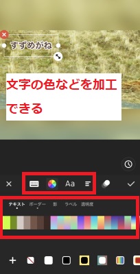 フォントサイズや種類、色の選択などが可能です。文字の位置の調整も可能です。