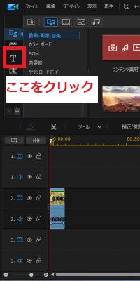 ドラッグ&ドロップなどで動画を読み込んだら、「T」マークを押して文字を挿入します。